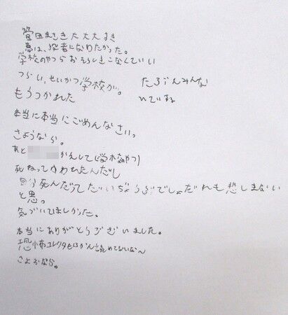 市教委などによると、女児は昨年9月24日に学校を欠席し、午後に自宅マンションから飛び降り、死亡した。女児は「自分死んだってだいぢょうぶでしょ だれも悲しまない」などと記したメモを残していた。